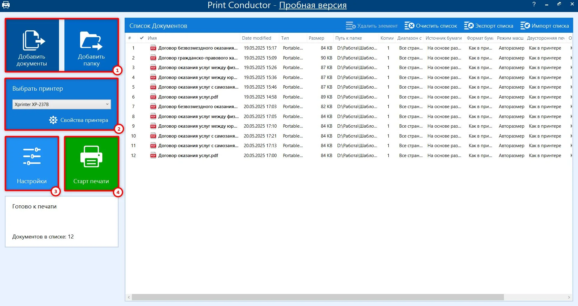 Простая фоновая программа для автоматизации пакетного режима. Она функционирует даже после перезагрузки компьютера и без запущенного окна. ПО упростит работу тем, кому необходимо регулярно размножать документы с одинаковыми настройками.