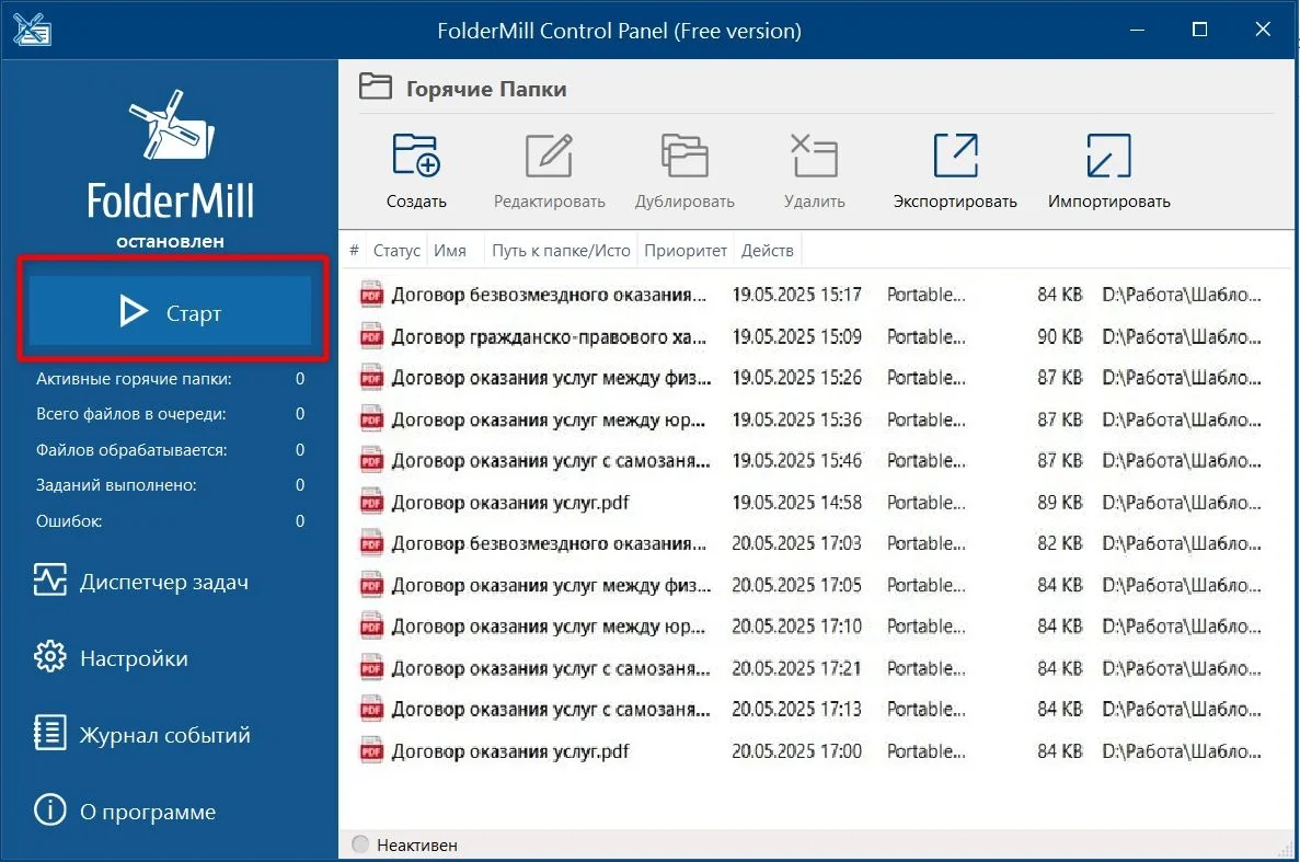 - Перенесите PDF-документы в указанную папку, щелкните «Старт». Далее все сеансы пойдут автоматически.