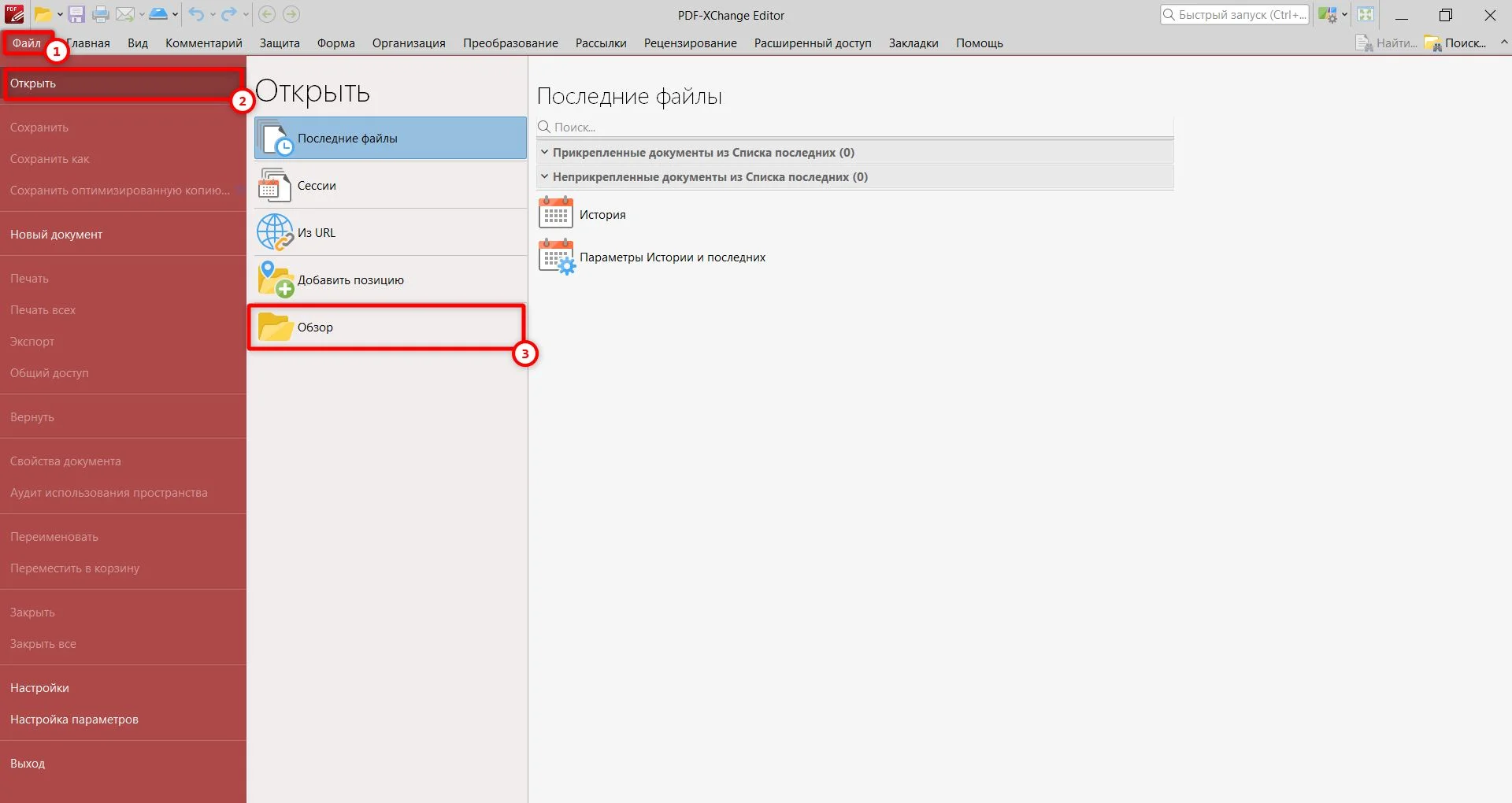 - Добавьте документы на рабочий стол PDF-XChange Editor. Для этого выполните последовательность: «Файл» → «Открыть» → «Обзор» → выберите элементы → «Открыть».