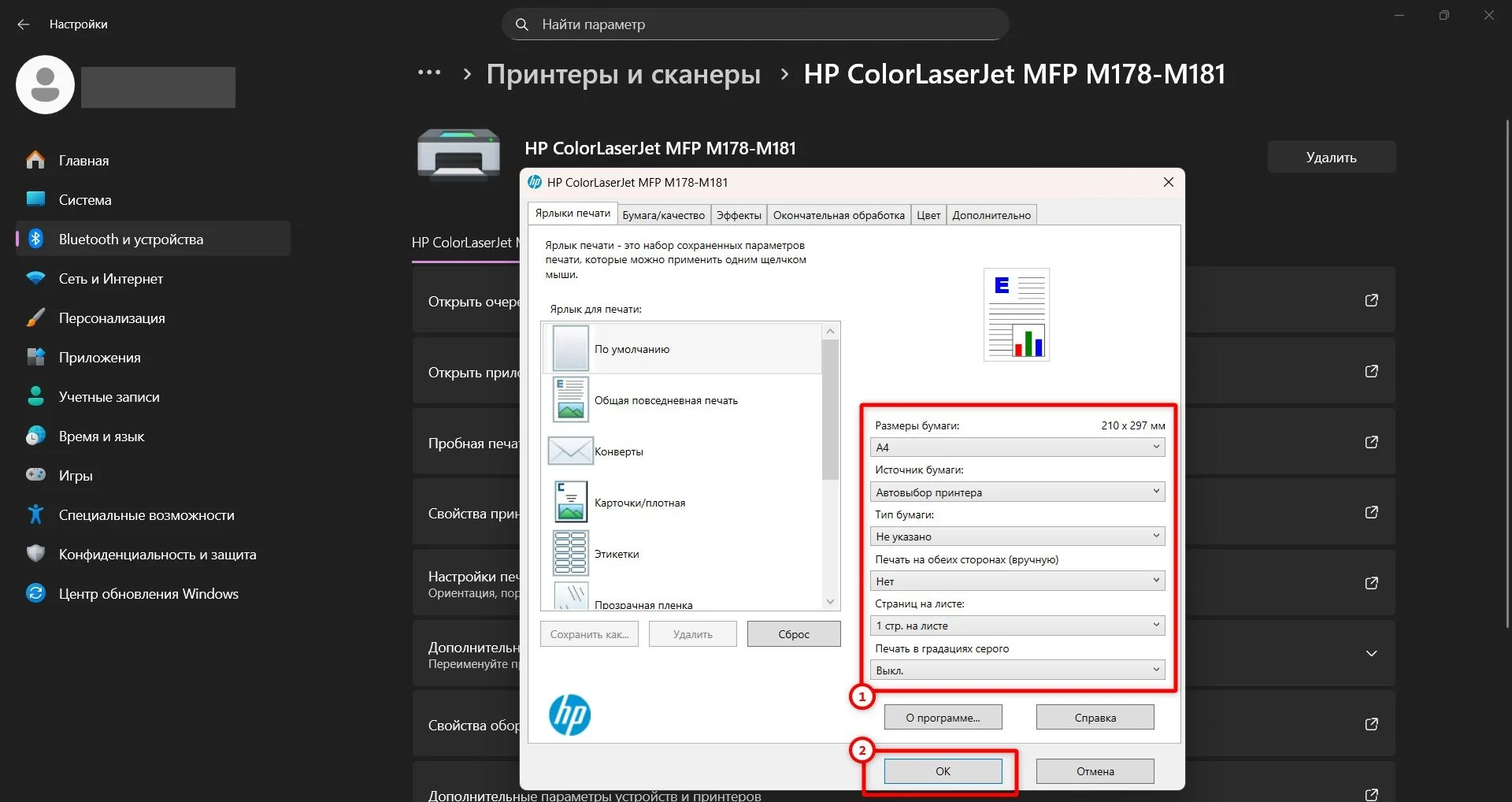 Справа от наименования есть настройки принтера. Здесь вы сможете отрегулировать параметры передачи цвета, а также его интенсивность и другие настройки.