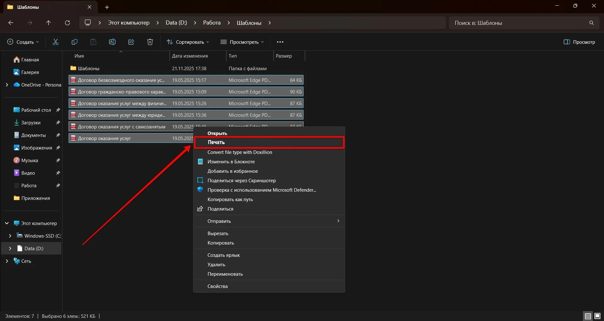 - Откройте папку с ПДФ-документами, выделите их, щелкните правой кнопкой мыши. В открывшемся списке выберите «Показать дополнительные параметры» → «Печать».