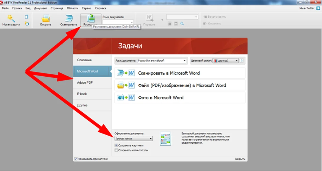 - Выберите формат сканирования документа (в Adobe PDF, E-book, Microsoft Word). Также можно сохранить или удалить картинки, которые присутствуют в исходнике.