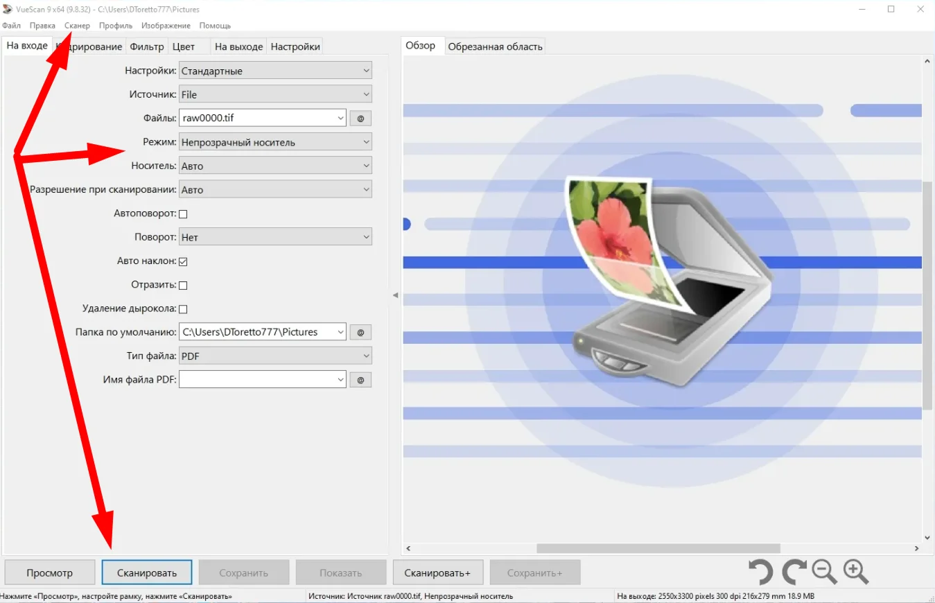 - Настройте приложение. Выберите сканирующее устройство, источник бумаги, глубину цвета, масштаб и другие параметры.