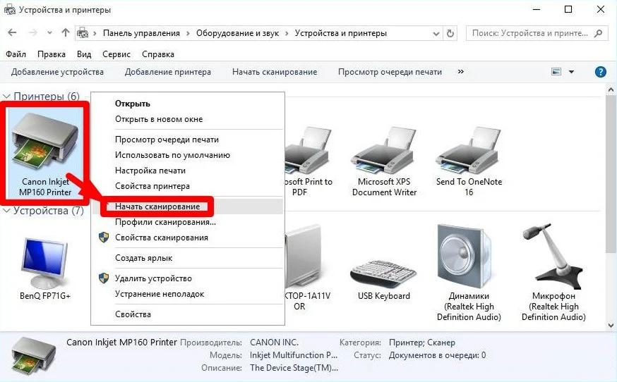 - Кликните правой кнопкой мыши по иконке сканера и в меню выберите «Начать сканирование». Следует заранее вставить лист в МФУ. После обработки изображения утилита создаст PDF-файл на компьютере.