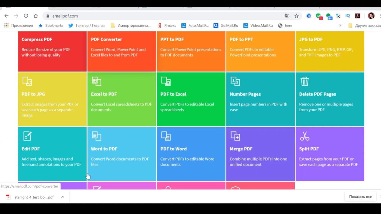 SmallPDF – не только бесплатный конвертер PDF онлайн, он также предлагает расширение для Google Chrome. Благодаря ему вы можете преобразовывать книги во время чтения прямо из браузера. Пользователям предлагается огромный пакет инструментов: доступно сжатие, разделение, просмотр с редактированием, наложение и снятие защиты, создание цифровых подписей. Пользователь может сохранить ПДФ как презентацию ППТ, изображение JPG, а также Word и Excel.