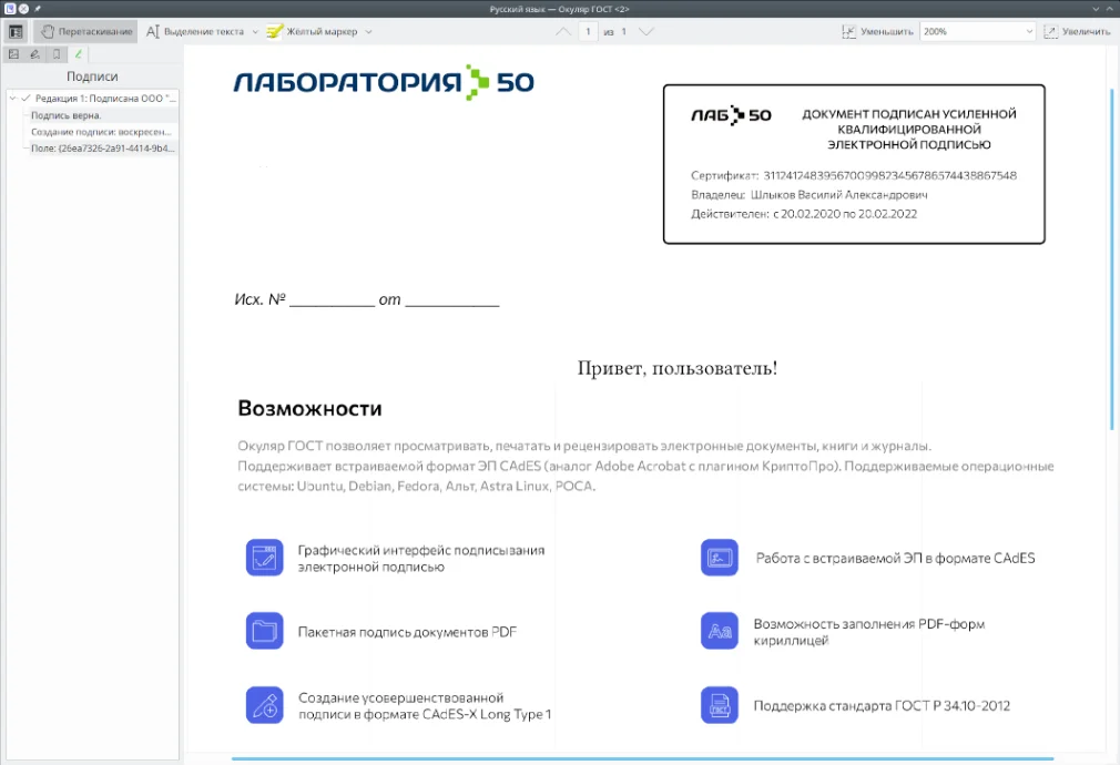 Это специализированное решение для российского рынка и юридически значимого документооборота. Его ключевая особенность — глубокая и официальная поддержка электронных подписей, в том числе формата CAdES на базе «КриптоПро», что позволяет работать с документами, подписанными по стандартам ГОСТ. Программное обеспечение создано для корпоративных пользователей, активно развивается с учетом актуальных требований бизнеса и не имеет лишних инструментов.