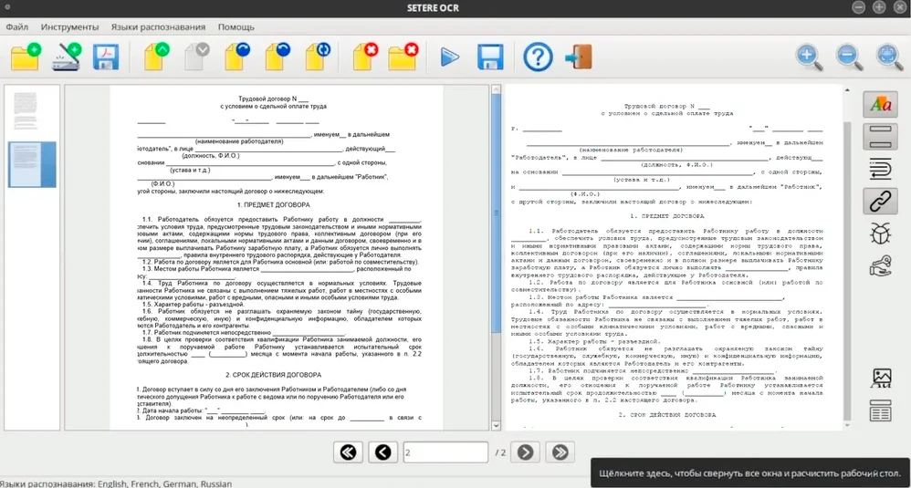 Если вы ищете эффективный офисный софт для обработки сканов, содержащих текст, изображения и схемы, стоит попробовать SETERE OCR. Программа отличается поддержкой большого количества языков (более 180) и способностью распознавать текст, произвольно расположенный на странице, включая таблицы. Это делает ее удобной для обработки договоров, финансовых и технических документов.