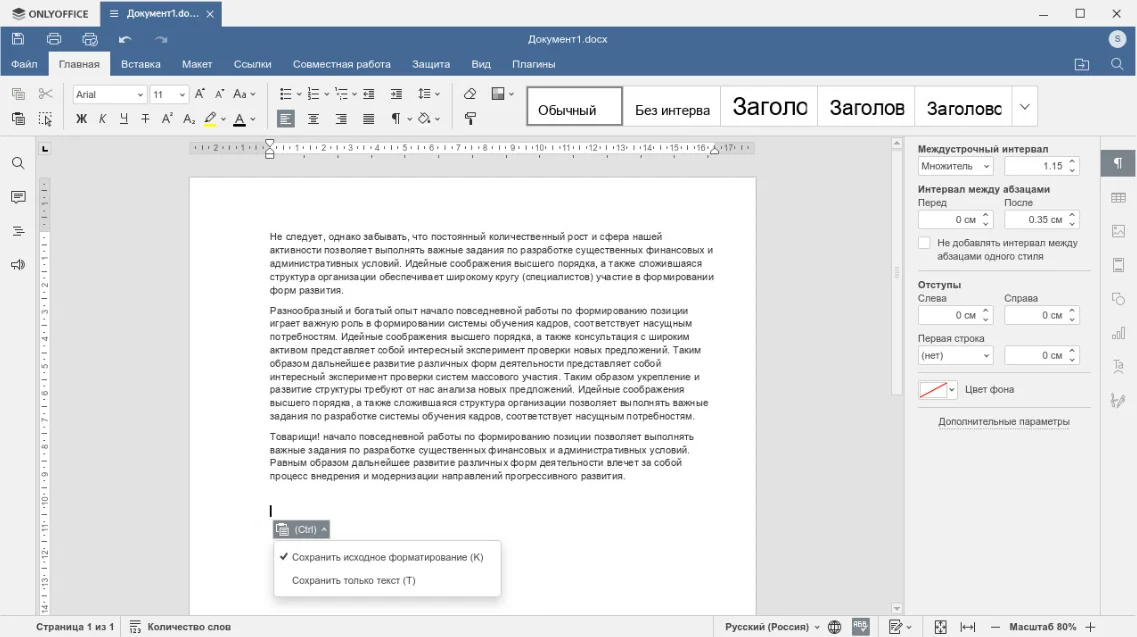 Приложение входит в пакет Onlyoffice. Особенность программы для офисной работы — полная совместимость с форматами, используемыми в Word. Приложение гарантирует сохранность форматирования при открытии и редактировании документов, созданных в Word, что пригодится компаниям. Стоит отметить, что есть не только десктопная версия, но также и онлайн-редактор с аналогичным функционалом. Софт доступен бесплатно для использования дома. Для бизнеса созданы 2 тарифа для развертывания на своем сервере (от 1500 евро) и для использования облачной платформы (от 8 евро за аккаунт).