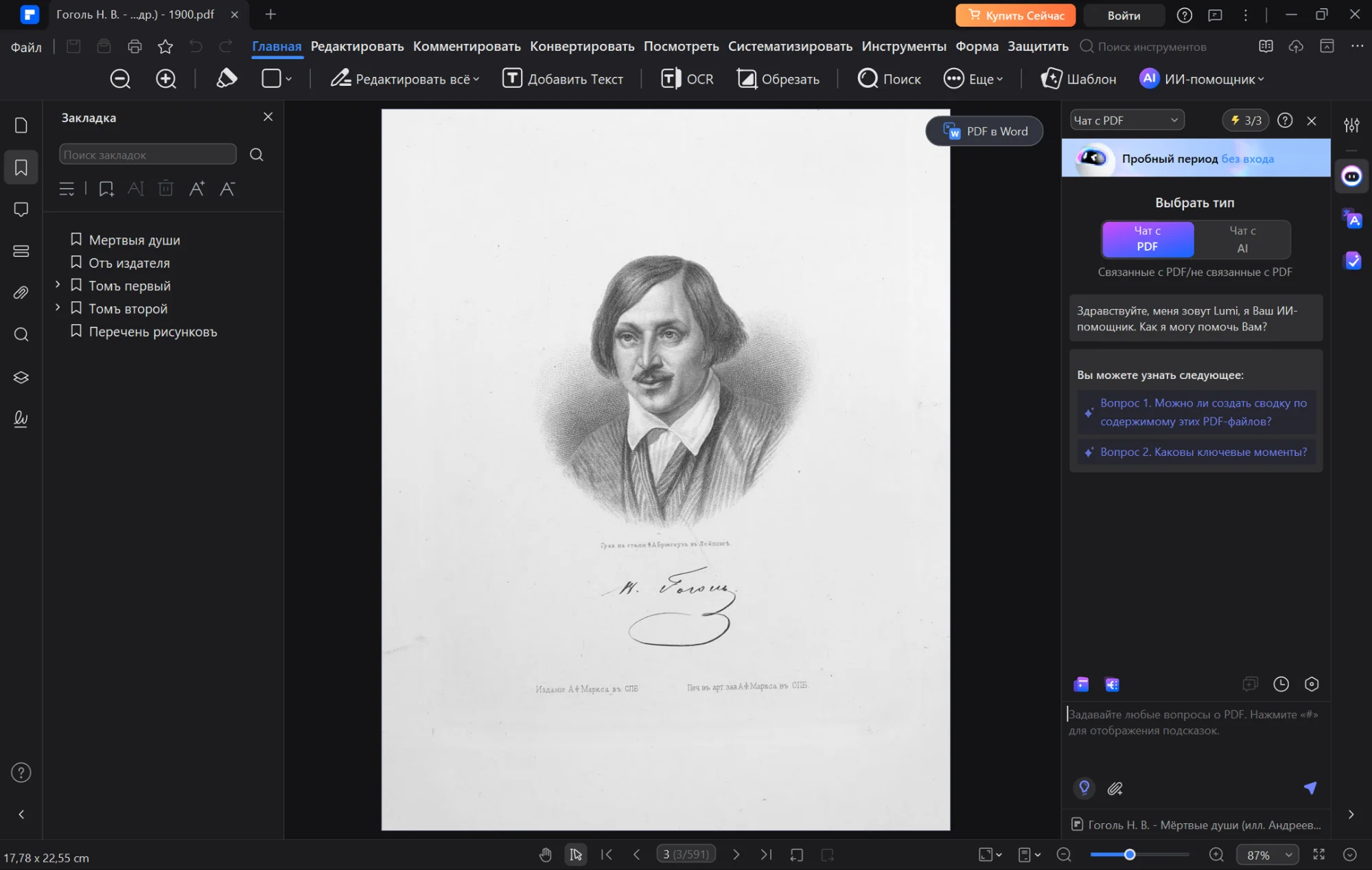 Позволит не только читать, но и редактировать документы, добавлять в них текст и картинки. Если в издании есть закладки, они будут удобно выведены слева от окна просмотра и кликом мышки вы сможете переместить на страницу. Если текст на иностранном языке, нужно будет просто выделить его, а софт корректно переведет предложение автоматически — за функцию отвечает искусственный интеллект.